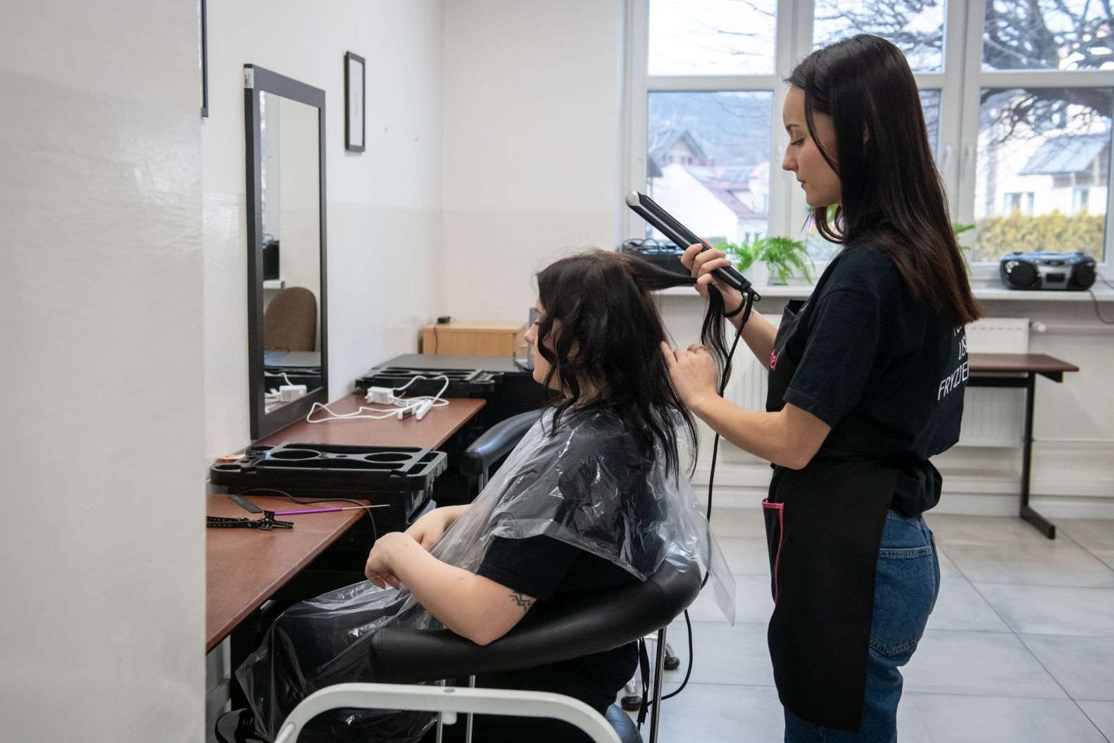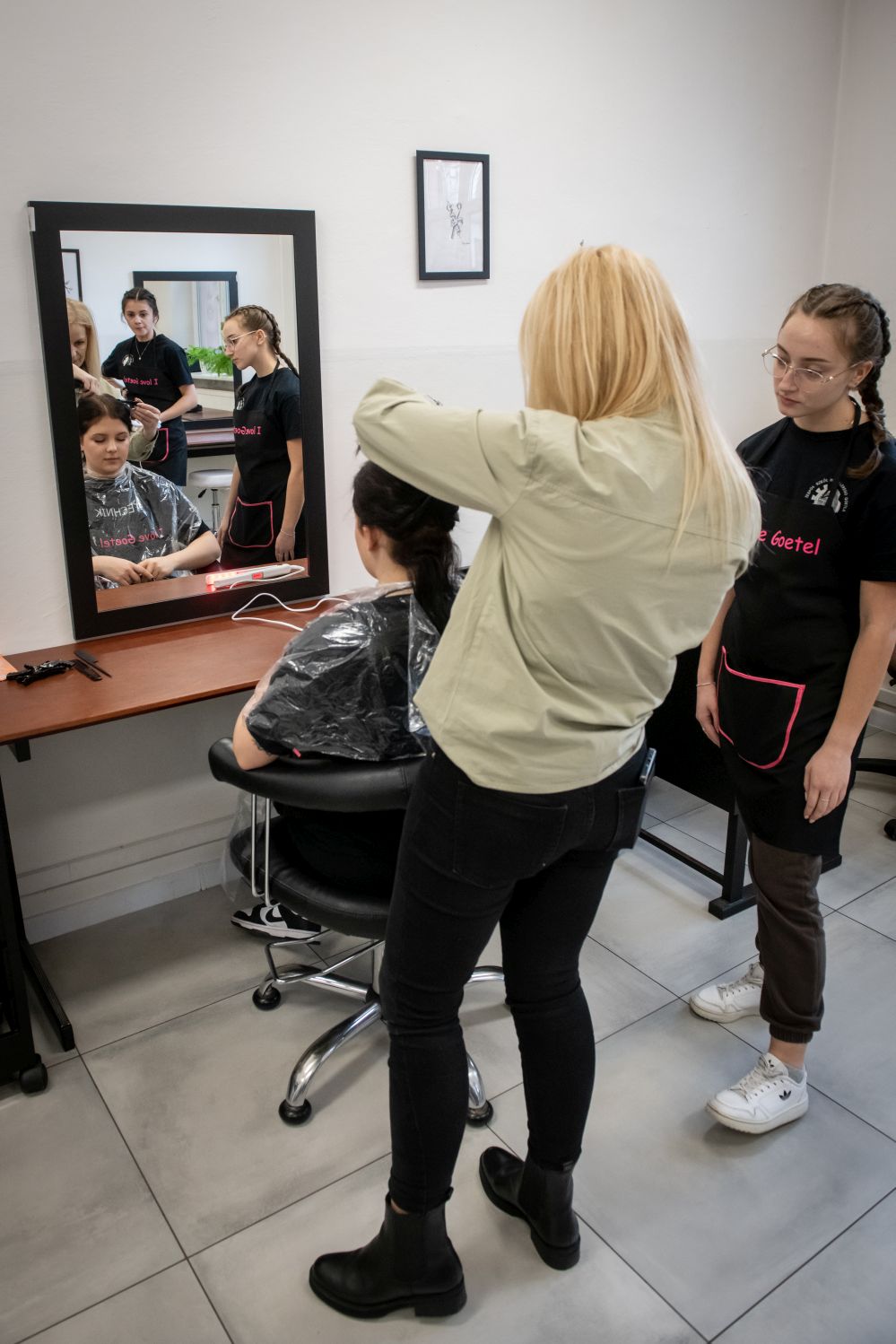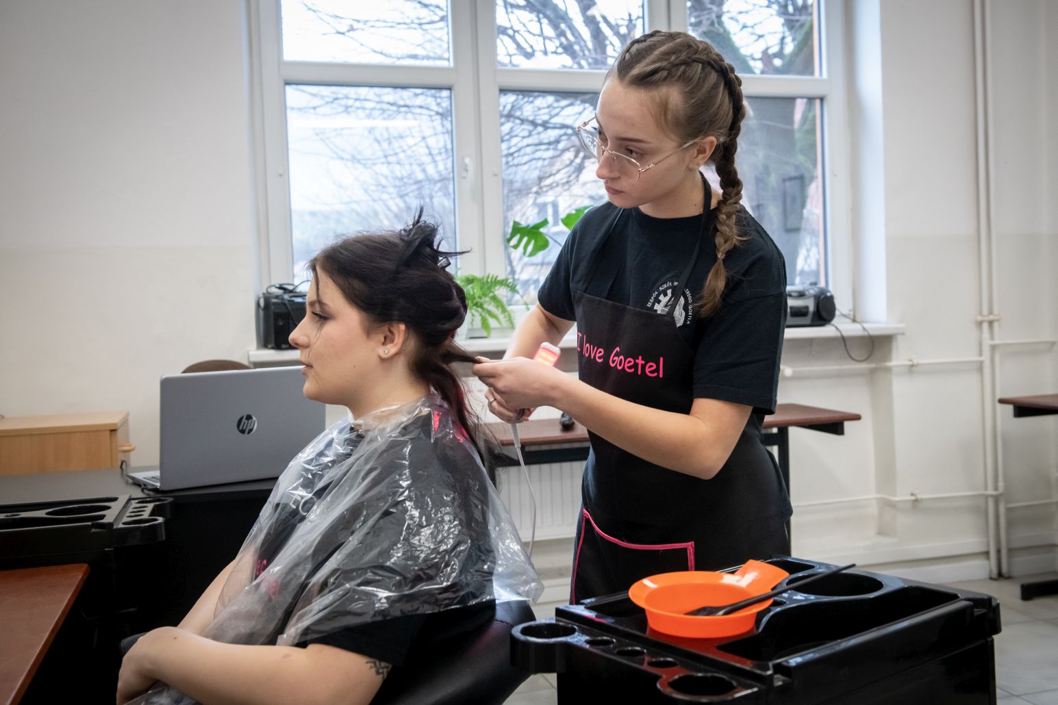 W budynku ZS im. W Goetla w Makowie Podhalańskim uczennice technikum usług fryzjerskich pod okien nauczycieli – mistrzów fryzjerstwa pełnią usługi fryzjerskie damskie i męskie w pełnym zakresie, m. in.
